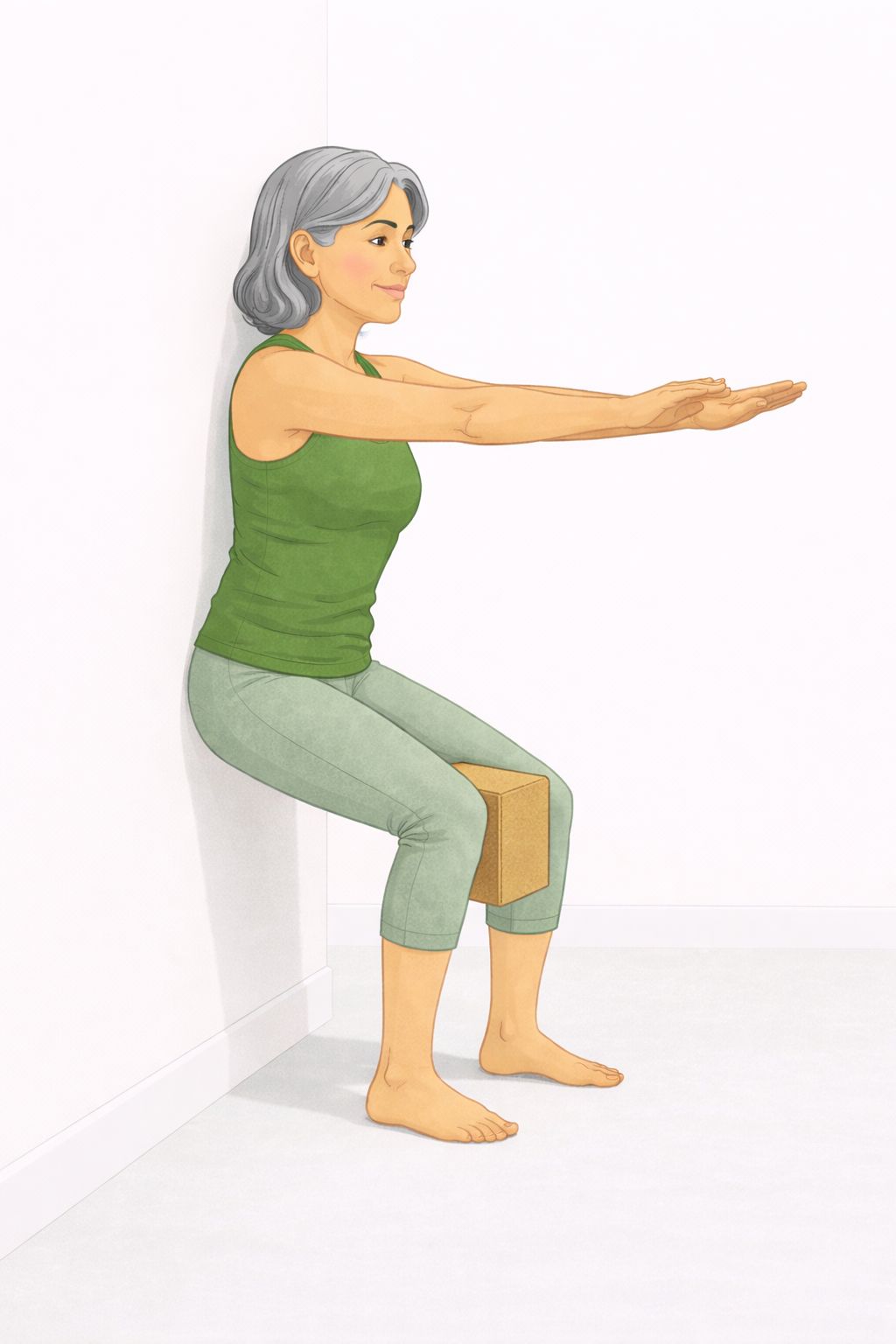 Don't go lower than where you feel steady. Even a shallow bend is building the right patterns. Place a block between your knees if they tend to fall inward.